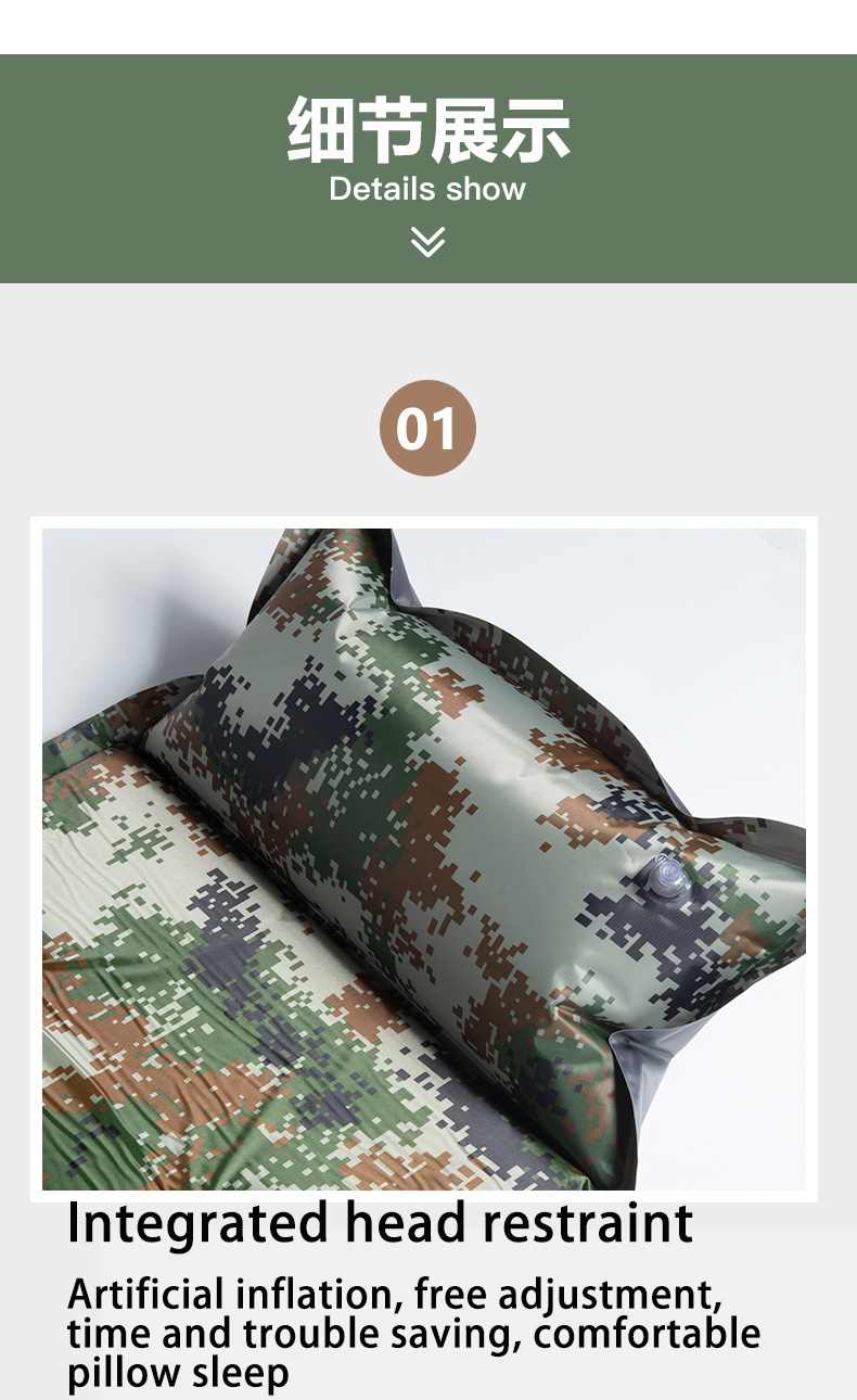 4. Pillow: For the pillow, inflate manually by blowing air. The air nozzle incorporates an anti-leakage setting. Hold the nozzle horizontally during inflation, ensure a tight fit of the back cover to prevent air leakage, and then press the air nozzle into the air pillow.