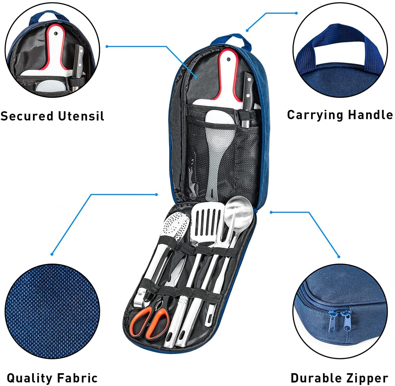 - MADE FOR TRAVEL – The compact camp kitchen case features an ergonomic shoulder strap for easy carrying. Each utensil has its own secure and sturdy pouch, ensuring that your camp accessories stay in place when you’re on the move.