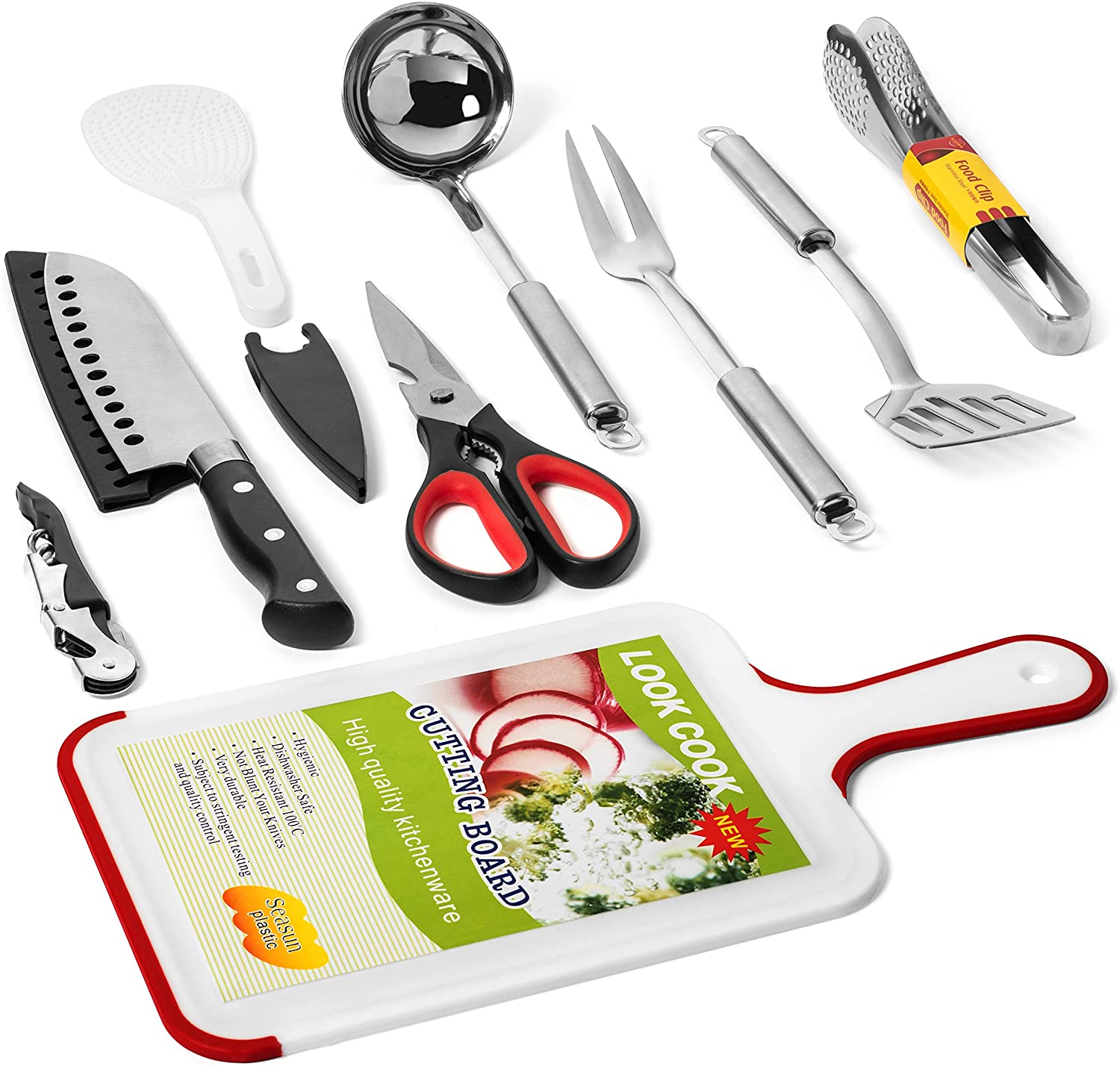 - ON-THE-GO CONVENIENCE – Our portable utensil organizer accommodates all essential kitchenware, including a Spatula, Serving Spoon, Serving Fork, Chef Knife with Sheath, Silicone Spatula, Scissors with a bottle opener, Tongs, and Cutting Board, meeting all your culinary needs.