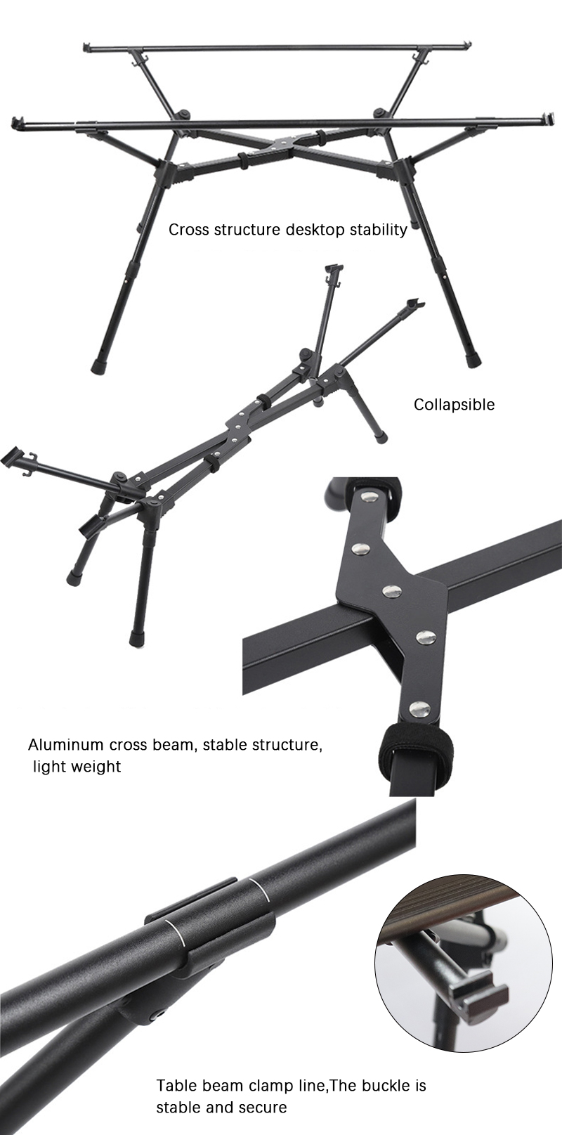 - Stable Structure: Movable support rods secure both sides of the frame, preventing shaking even when loaded. The snap under the tabletop grips the frame tightly for stability during use.