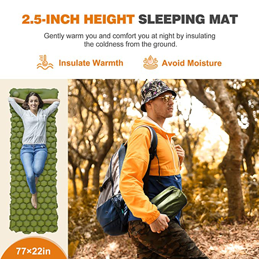 - Sturdy and Comfortable Design: Crafted for enhanced softness and durability, our camping mattress features high-quality, waterproof 70D nylon with a TPU lining. The 2.5-inch thickness provides insulation from rough, hard, and cold ground. The ergonomic texture on the surface promotes better sleep, offering increased support and improved balance.