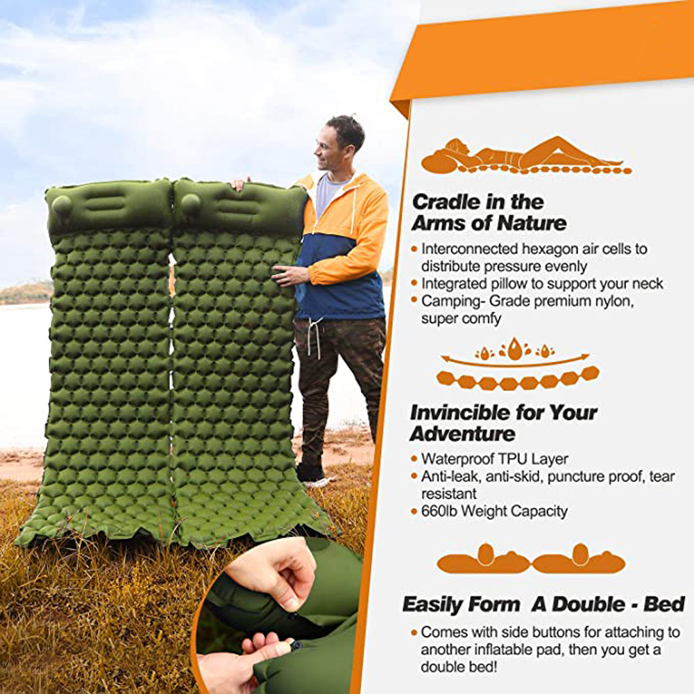 - Connectable and Enhanced Pillows: Connect two mattresses effortlessly to create a double bed, thanks to the snap on the side. We’ve also prioritized neck support by adding an ergonomic pillow to the camping mat, perfectly fitting the body curve for excellent support and comfort.