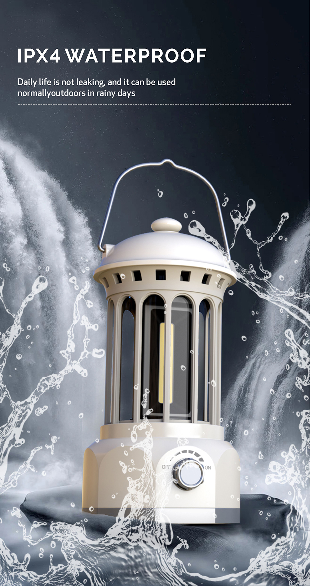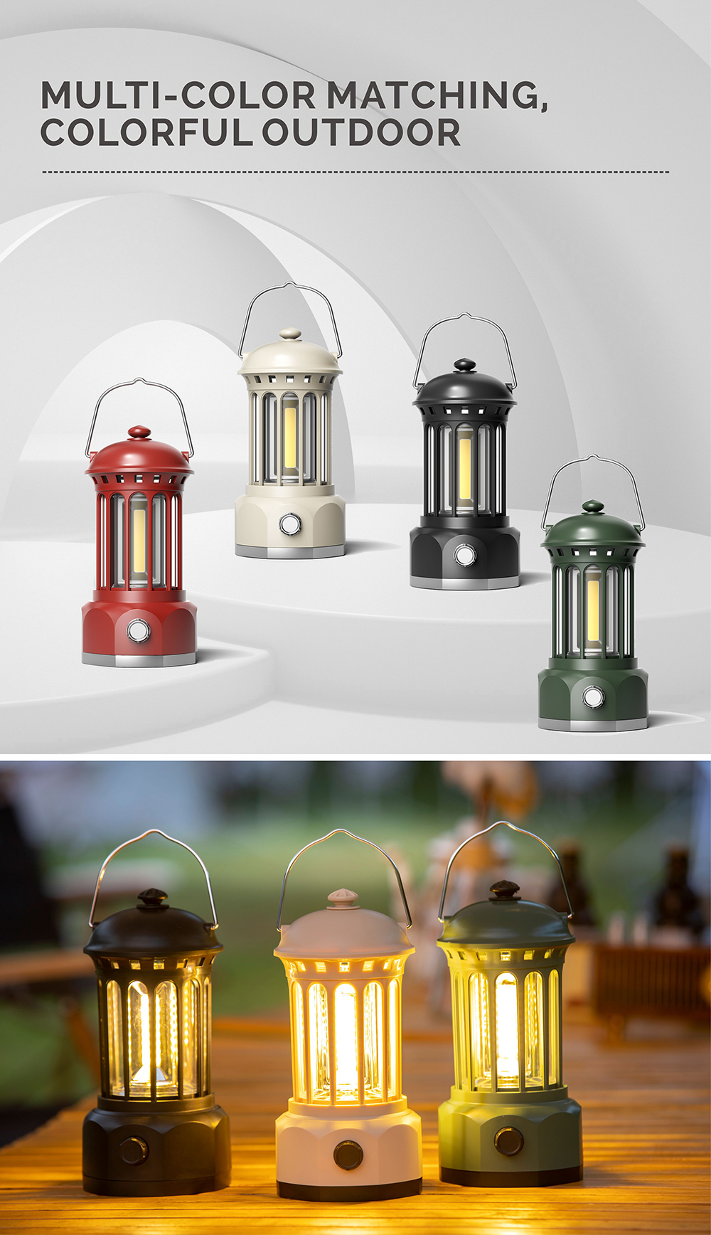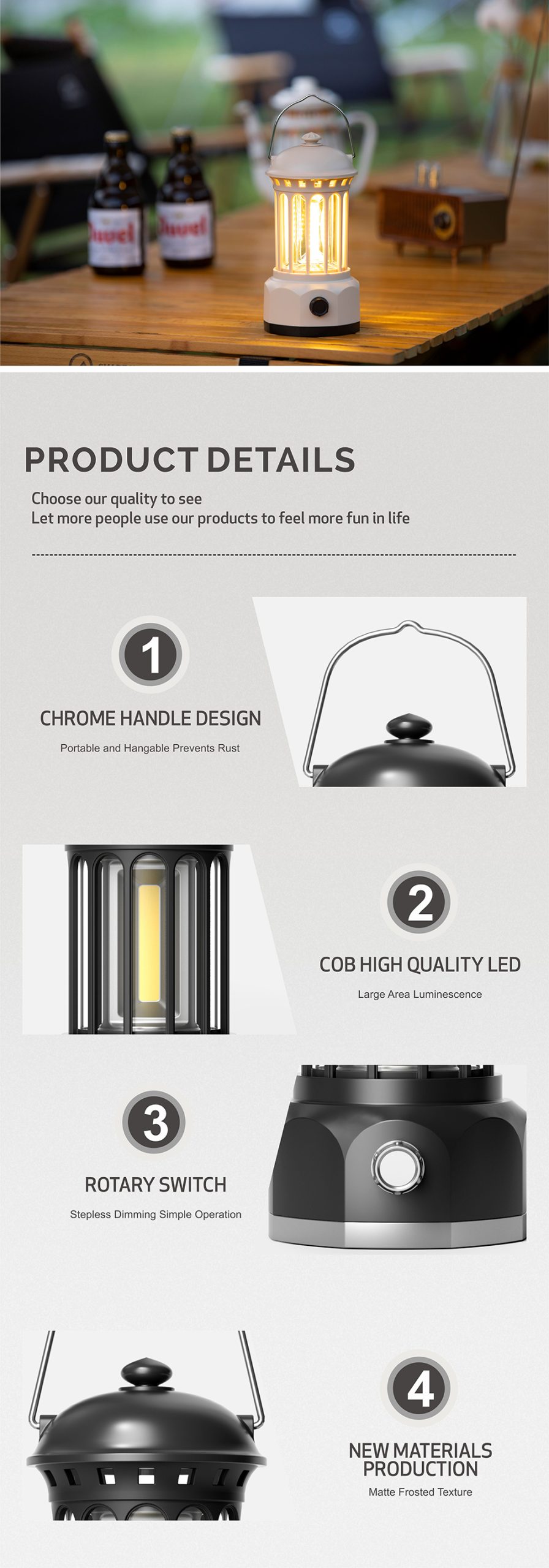 - Versatile Illumination: Utilizing advanced COB lighting technology, the rechargeable battery lantern delivers high brightness with stable performance. Featuring IPX4, warm white light, and a rotating switch button, users can easily adjust the brightness to their preference.