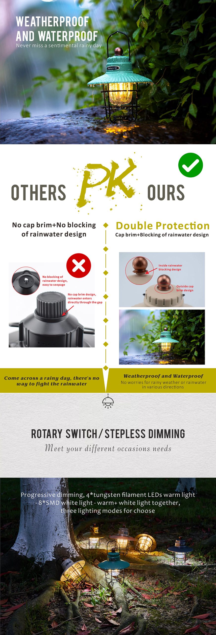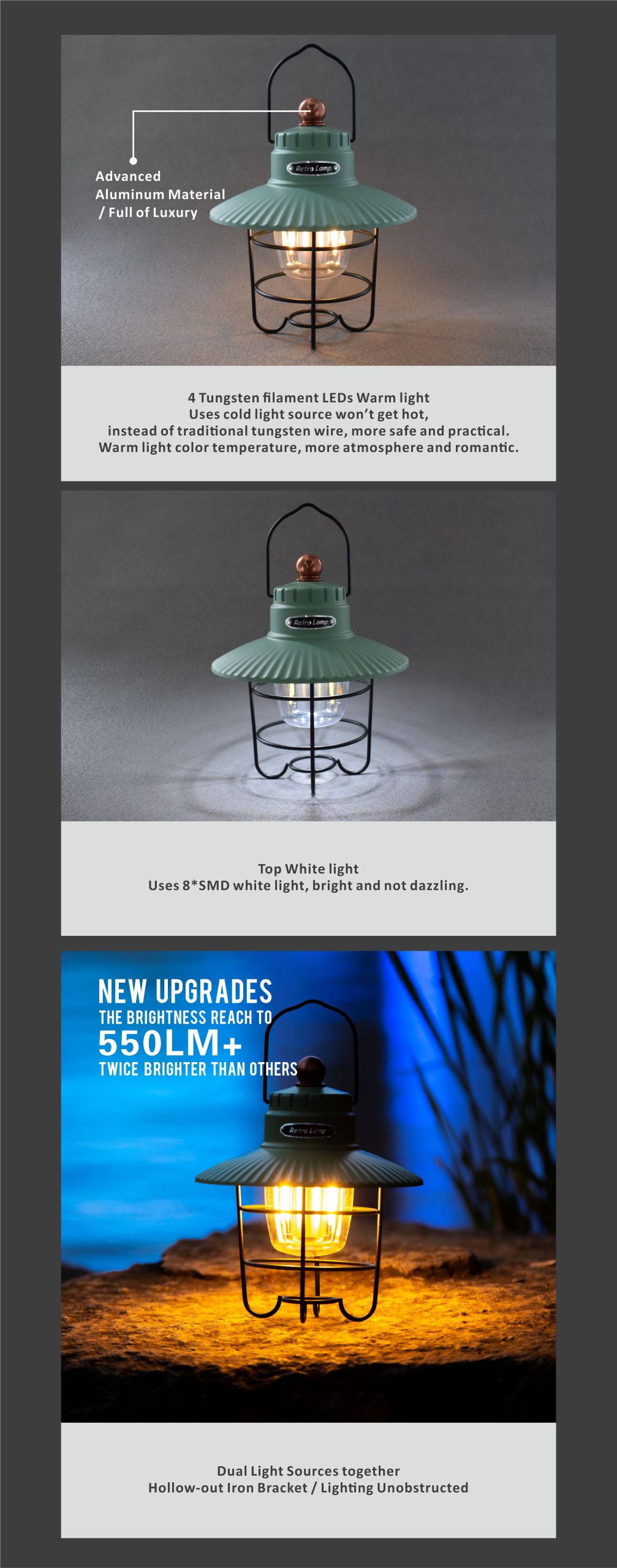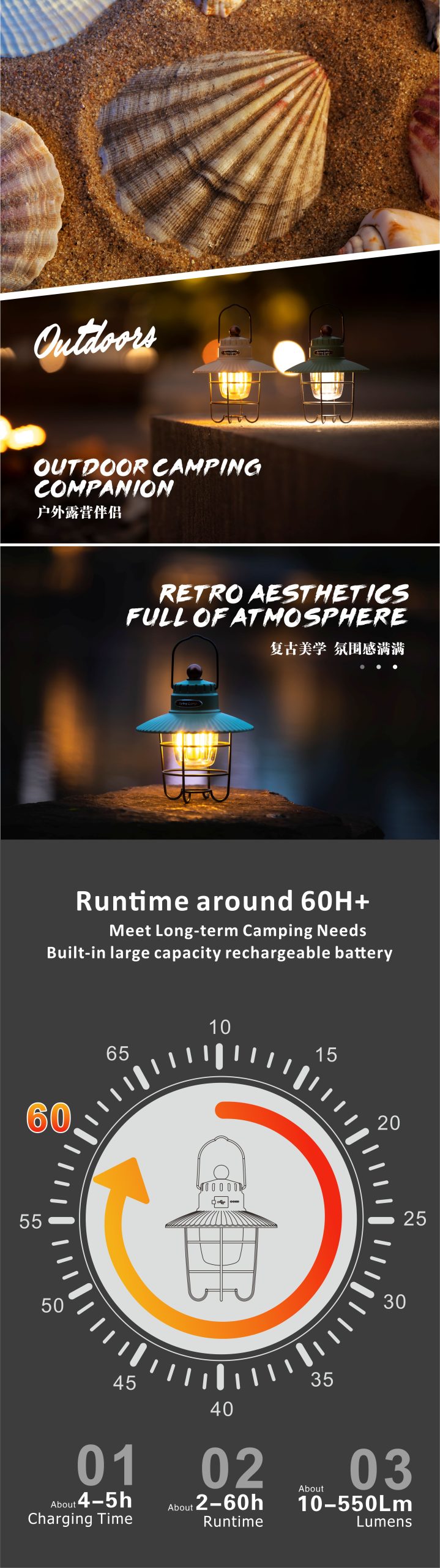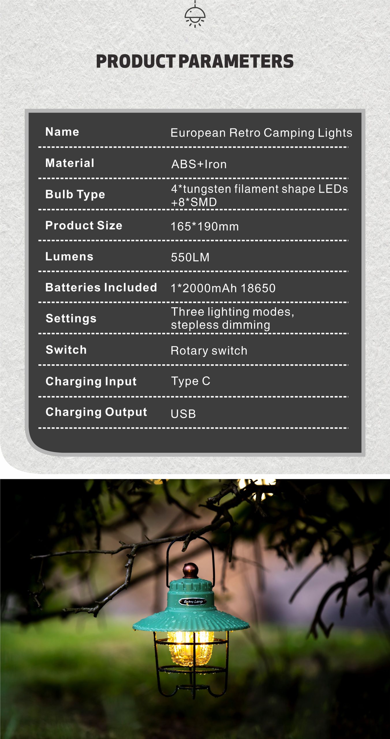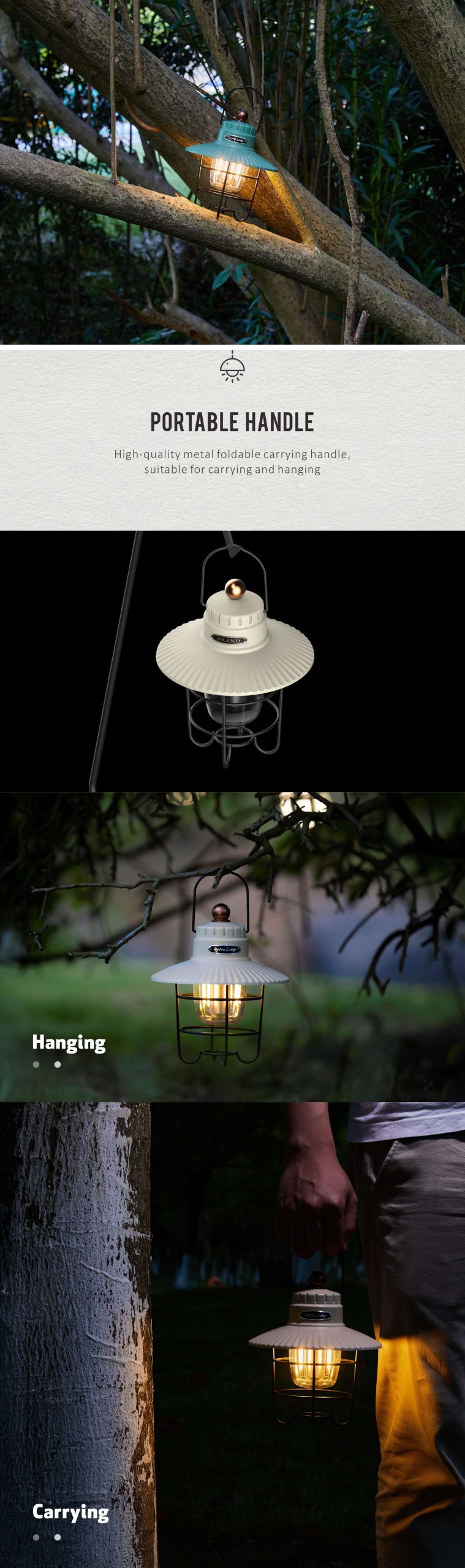 Retro Elegance: With its vintage style and traditional barn lantern-like shape, this camping light adds a touch of retro elegance to your camping trips, outdoor dining experiences, or peaceful evening strolls.