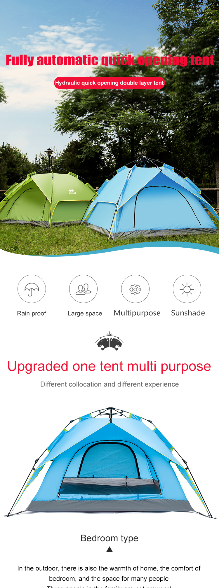 • The hydraulic tent serves three purposes: for outdoor and indoor use together, as a single indoor tent, or as a standalone outdoor tent.
