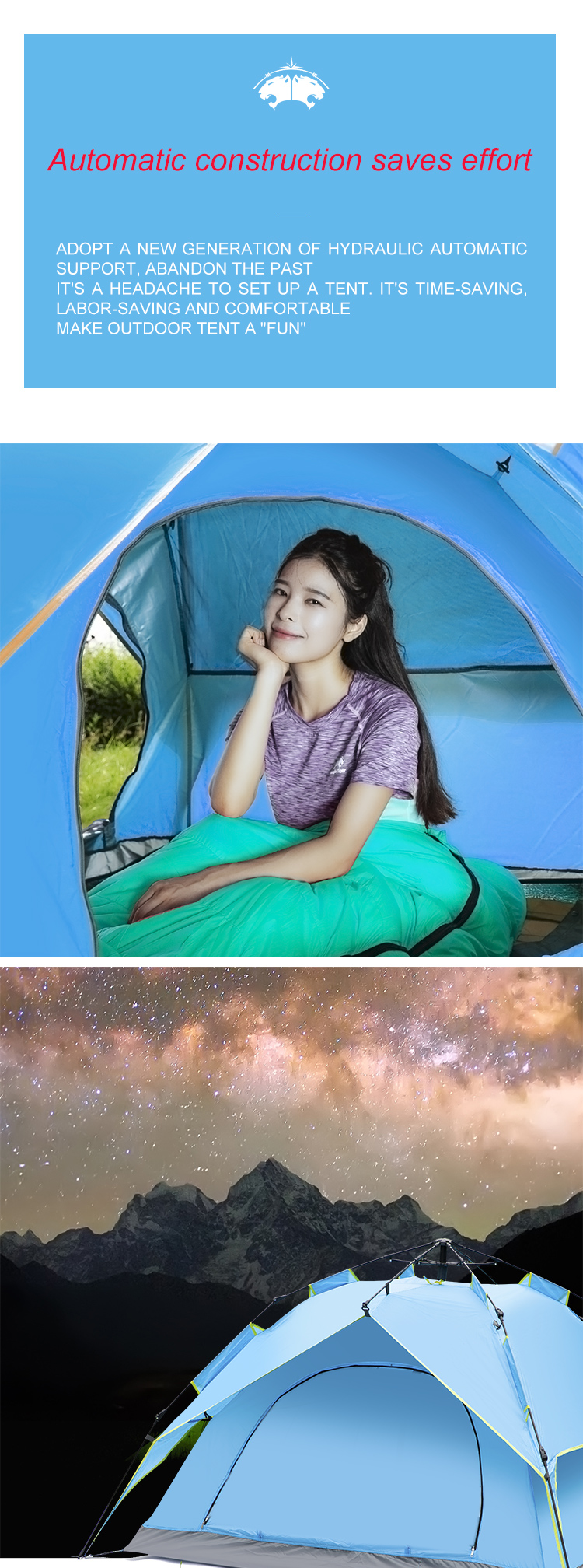 • Accommodates 3-4 people with a hydraulic design for easy setup and takedown.